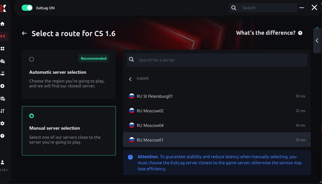 Manual server selection → Region: Europe → Server: RU Moscow01
